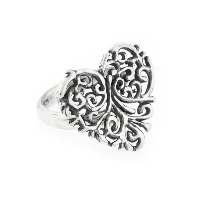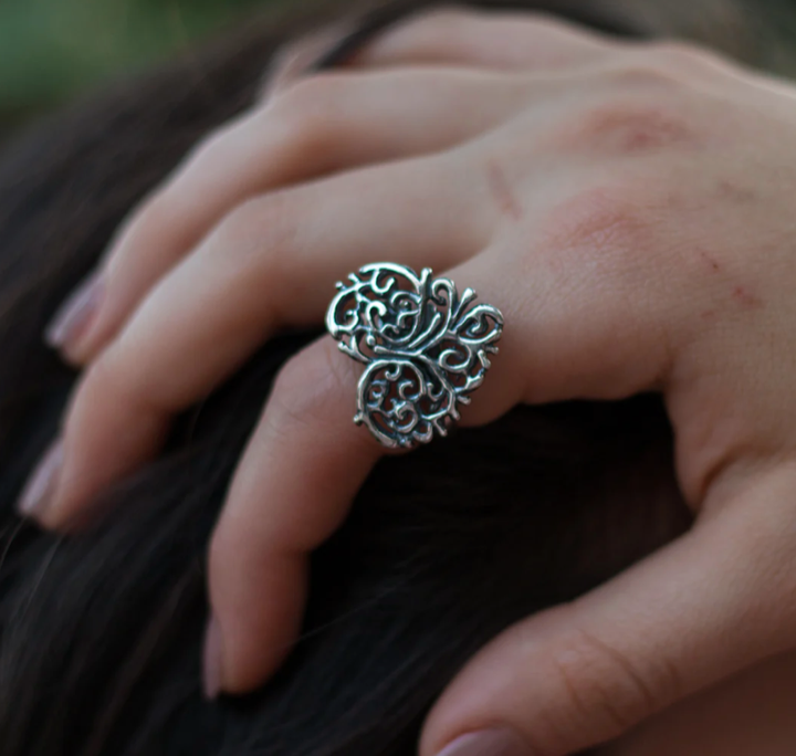 El anillo, dada la maleabilidad de la plata, se puede abrir y cerrar ligeramente para ajustarlo con comodidad y seguridad a tu dedo. Tiene un terminado llamado pavonado para dar contraste entre las crestas y los valles del diseño. Está hecho en plata .925.